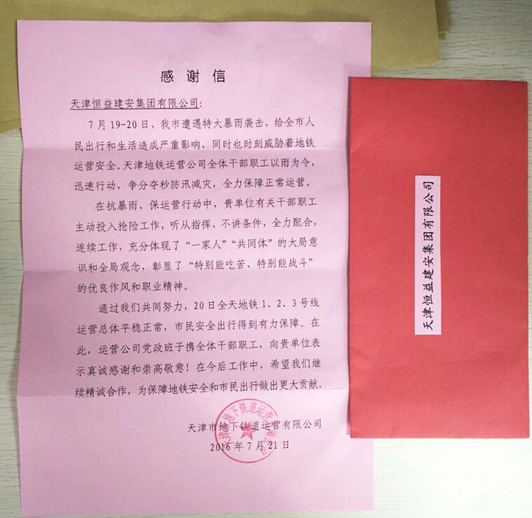 暴雨过去了,留给我们的是感动,感动于每位同事的付出,感动于他们的毫无怨言,更感动于天津恒益建安集团这个大家庭的优良作风和职业精神。8月6日,地铁6号线首开段正式开通运营了,天津市地下铁道运营有限公司给我公司发来了感谢信,表彰我们在抗暴雨、保运营行动中彰显出的“特别能吃苦、特别能战斗”的优良作风和职业精神,为确保天津地铁6号线首开段按时运营做出了贡献。在地铁6号线首开段正式运营的那一刻,在接到业主感谢信的那一刻,我们是欣慰的,至少可以证明我们的辛苦是值得的,是得到认可的!
