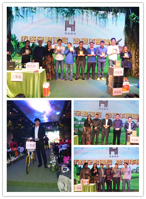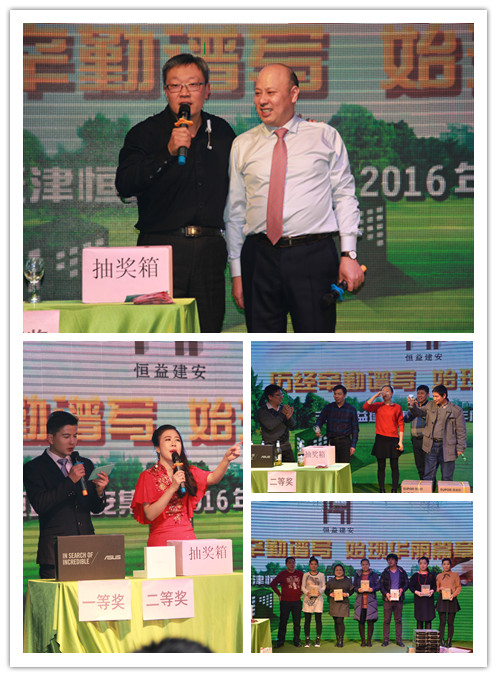 在抽奖环节中,四位嘉宾为我公司年会赞助了现金与纪念品,将抽奖环节推向又一高潮。他们是长虹家具大世界董事长徐振华先生、天津明一辉空调设备厂总经理乔明辉先生、同方川崎总经理范毅先生、顿汉布什总经理杨晓斌先生。另外,约克空调黄庆阳先生当场以“恒益建安”赋藏头诗一首,歌颂了双方企业多年来经营历程与友好合作。