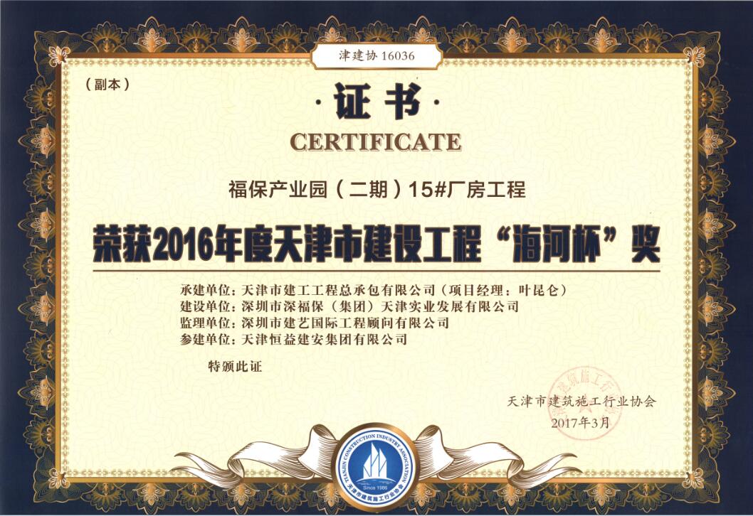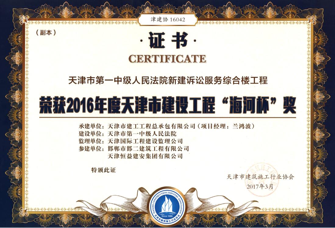 近日,我公司再次喜摘两顶桂冠,它们是“天津市第一中级人民法院新建诉讼服务综合楼工程”和“福保产业园(二期)15#厂房工程”两个装修工程均荣获2016年度天津市建设工程“海河杯”奖!