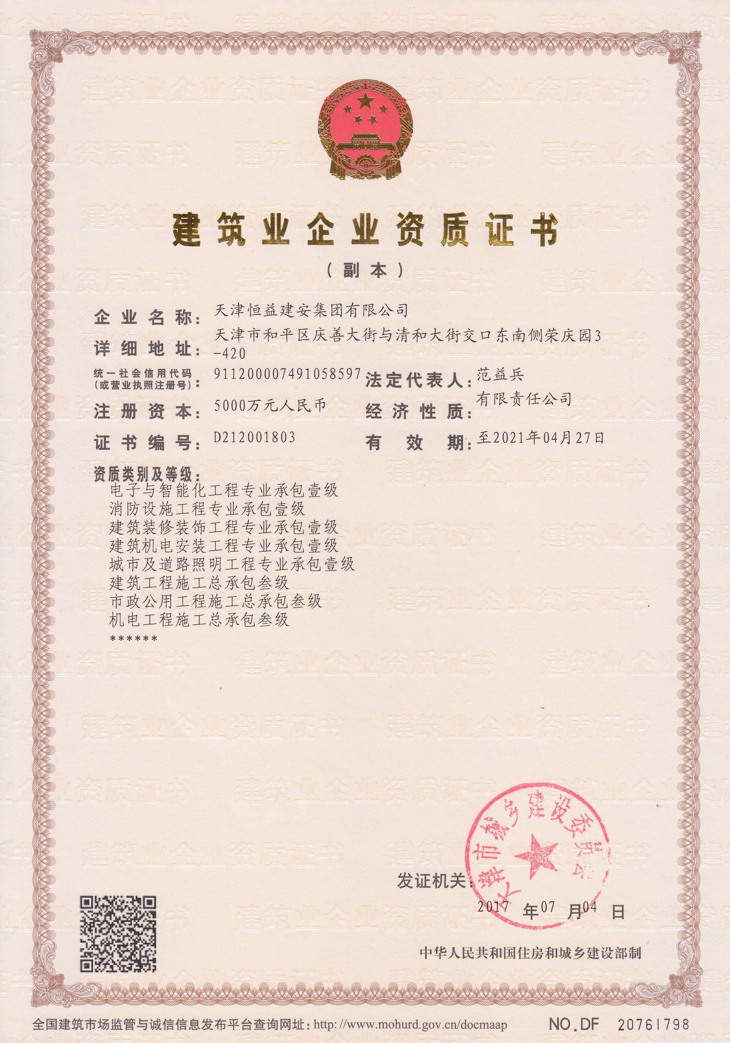 2017年7月10日,当我从建委窗口的工作人员手中接过了最新的施工资质证书,新增项的三个施工资质赫然入目:“建筑工程施工总承包叁级”、“市政公用工程施工总承包叁级”、“机电工程施工总承包叁级”。这一刻我抑制不住激动的心情,因为它们的到来不仅意味着我恒益建安集团终于可以从专业承包迈向施工总承包的领域,更是在恒益建安集团发展史中竖立了又一个重要的里程碑!截至目前,我公司已经具有建筑机电安装工程专业承包壹级资质、建筑装修装饰工程专业承包壹级、城市及道路照明工程专业承包壹级、消防设施工程专业承包壹级、电子与智能化工程专业承包壹级、建筑工程施工总承包叁级、市政公用工程施工总承包叁级、机电工程施工总承包叁级的施工资质等级。
