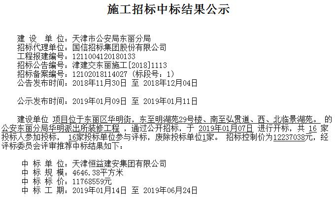 新年伊始,公司迎来首个中标项目,成功中得“公安东丽分局华明派出所装修工程”。以11768559元的价格在16家投标单位中脱颖而出。公司凭借过硬的资质、雄厚的技术力量和合理精准的价格,喜中2019年第一标,开启了2019年新的征程。