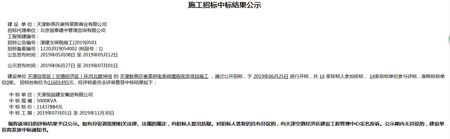 近日,天津恒益建安集团有限公司中标天津新燕莎奥莱供电系统增容改造项目。以2019年又一千万级电力项目为公司在电力施工领域开疆扩土,使公司在机电、装修、消防、建筑智能化以及城市景观亮化工程等多元化版块施工中再添新助力!