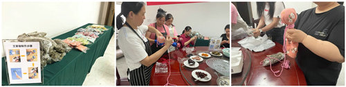 活动开始,大家观看了艾草锤的制作视频,跟着教学步骤,取艾草包、放入木柄、捏紧团球、包裹棉布、缠绕棉线……尝试着不同的绑法,室内随处飘散着艾草芬芳,一个个色彩绚丽的精美艾草锤跃然成型。